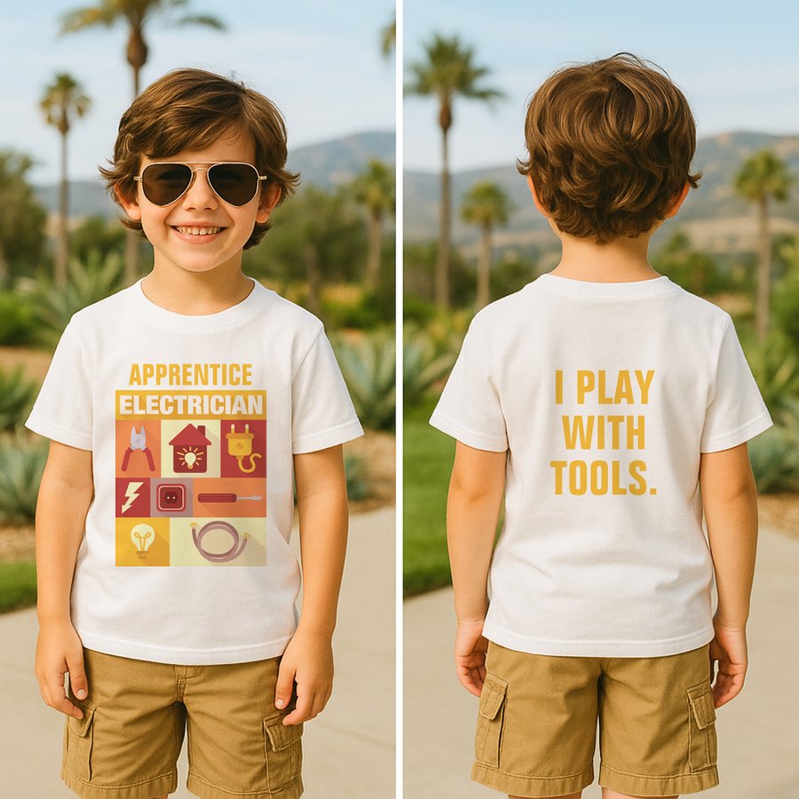 Fun, children's occupational profession of realtor theme design with icons and graphics related to real estate sales and selling. Edit if you want to, the text on back that reads, "I can make you buy anything" with the template provided.